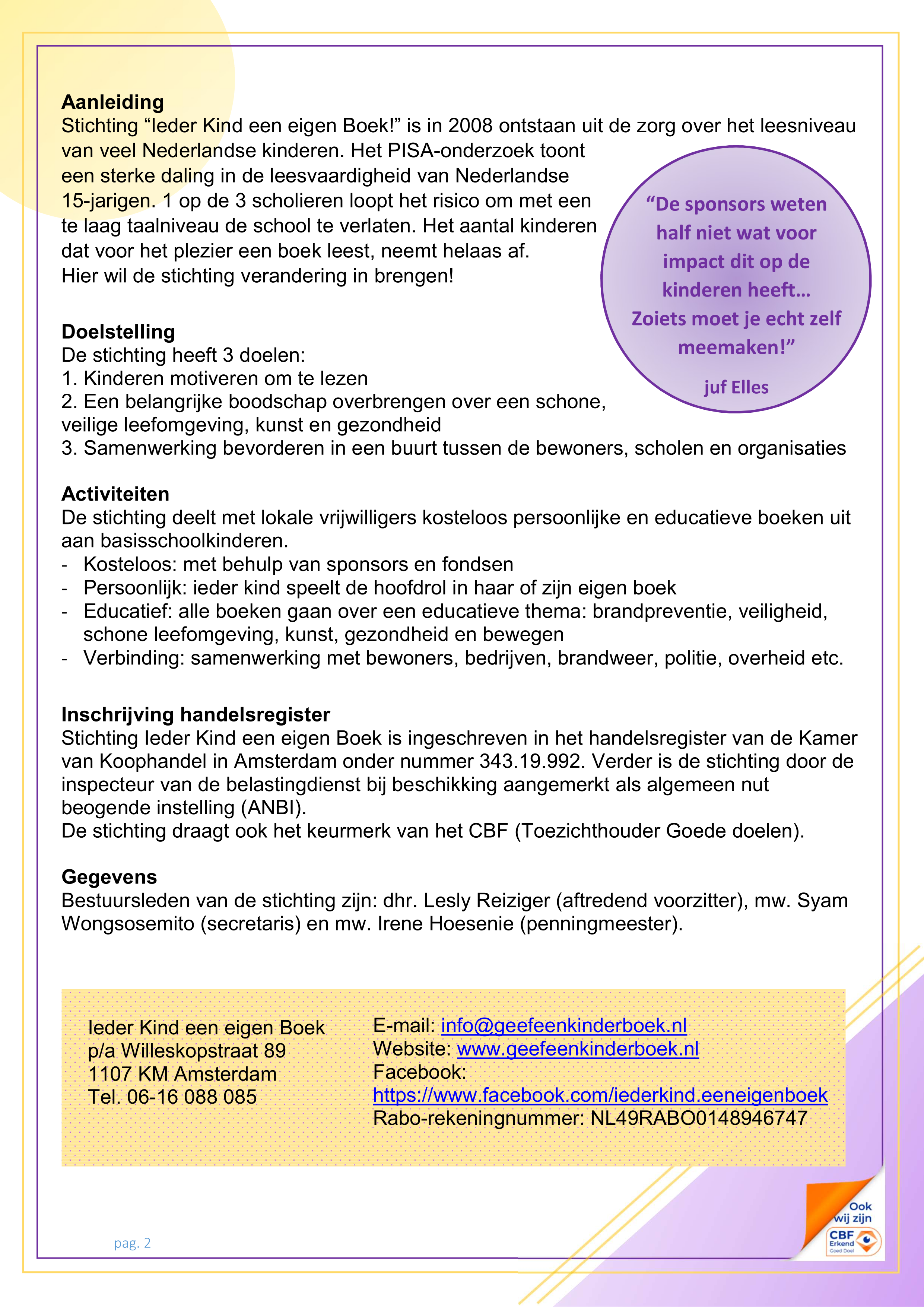Stichting Ieder Kind een eigen Boek heeft een ANBI en CBF keurmerk en is volledig afhankelijk van giften en vrijwilligers.